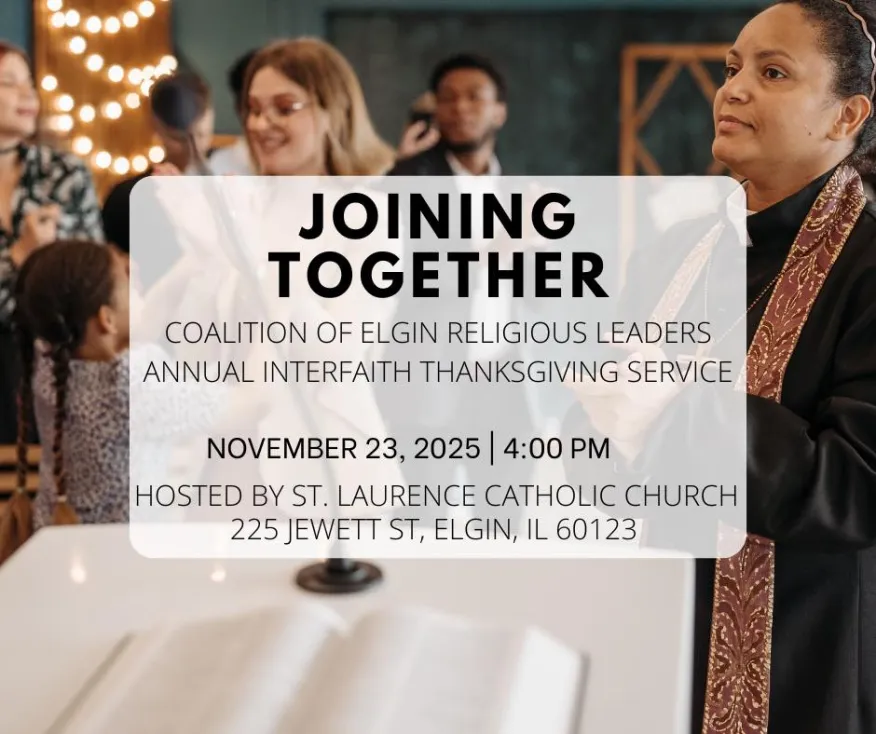 Coalition of Elgin Religious Leaders led a powerful Interfaith Thanksgiving Service featuring readings and music by community members practicing a variety of faiths and beliefs. Aron Ryan performed Elgin: City of Light, a poem inspired by Elgin’s diverse faith communities.